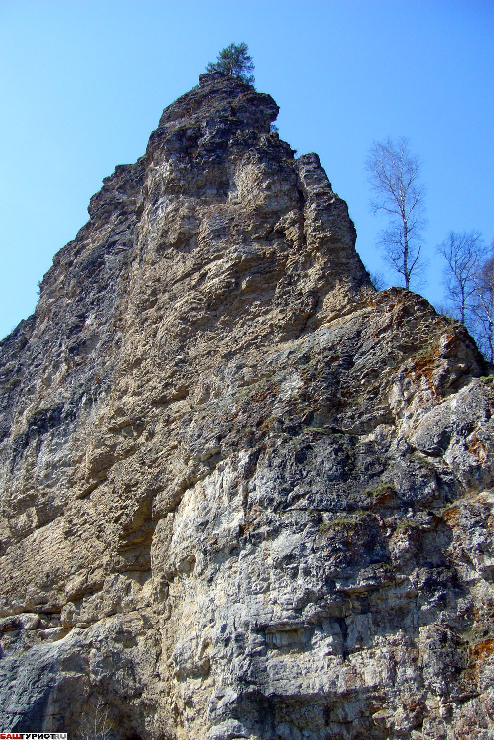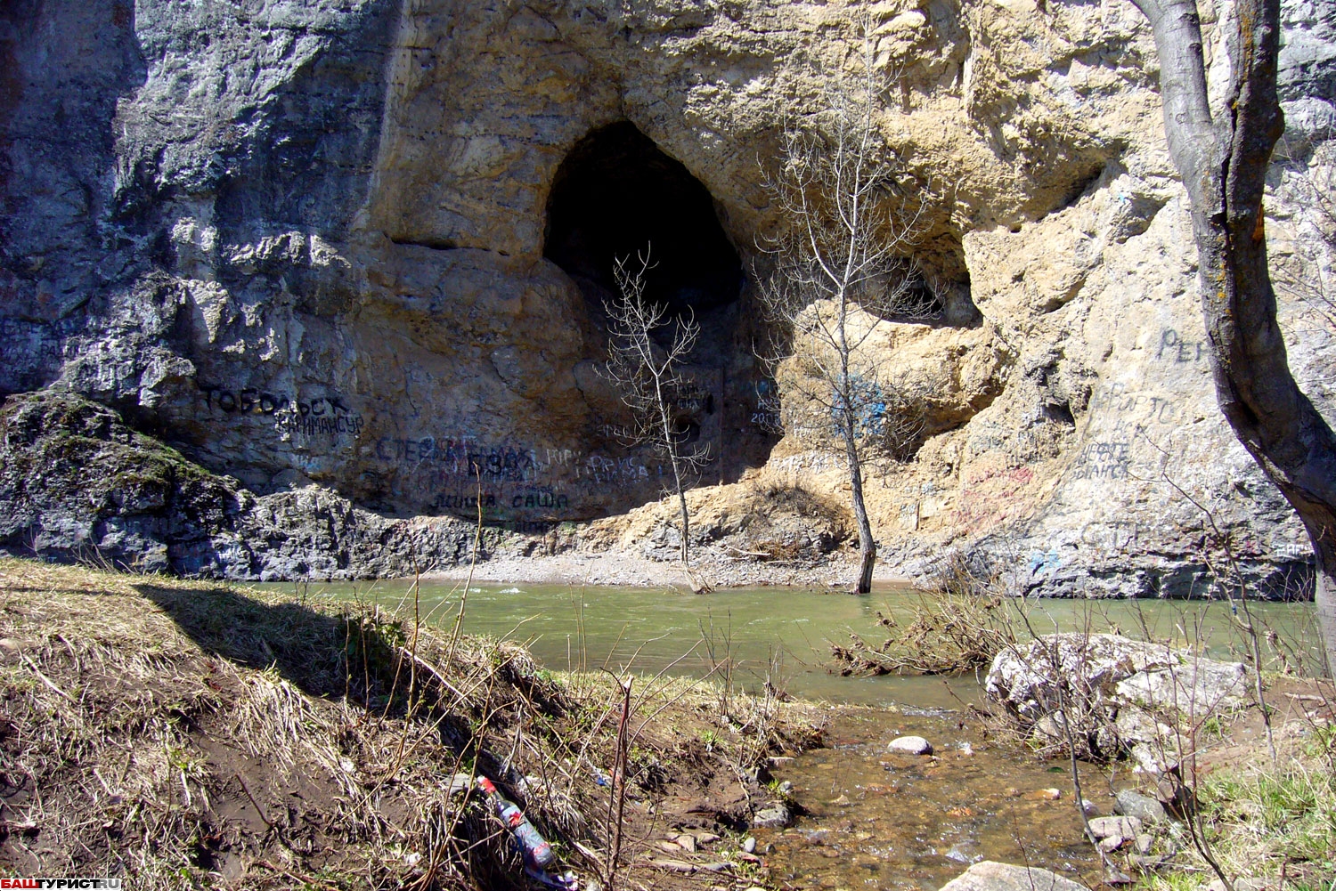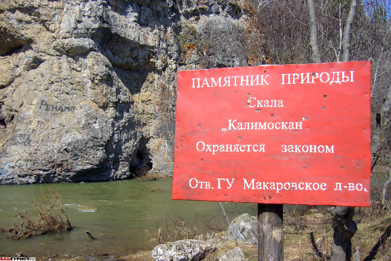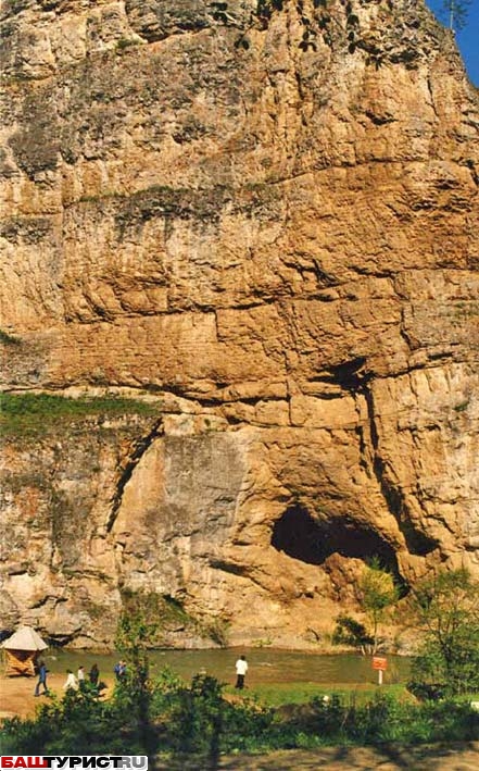 Скала Калим-ускан и пещера Салаватская. Скала. Пещера. Река