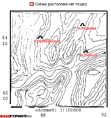 » Схема расположения пещер Победа (Киндерлинская), Леднева, Октябрьская